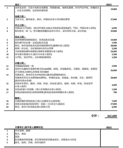 - 項目鉅細無遺:一份專業的報價單應列明每個工序的施工範圍、工藝、物料及價錢。例如防水工程,應註明施工位置、採用的物料、防水層的高度,以及會否進行試水測試。