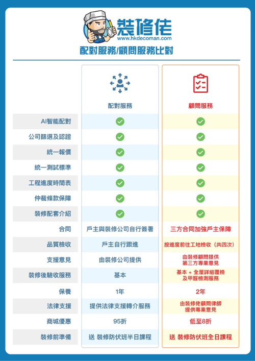 - 專業顧問支援服務:從配對開始到工程完結,經驗豐富的裝修顧問可以全程跟進,並提供專業中立的建議,協助業主與裝修公司順暢溝通,確保工程順利。