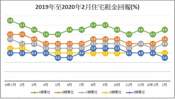 如想知道現時香港住宅的租金水平及租金回報,可參考差餉物業估價署的「市場回報率」,現時住宅分為A類(431平方呎以下)、B類(431至752平方呎)、C類(750至1,075平方呎)、D類(1,076至1,721平方呎)及E類(1,722平方呎或以上)。由1991至2019年的租金回報數字顯示,中小型單位的租金回報比大型單位為佳,2019年A類單位的租金回報是2.6%,比較大型的D、E類單位為1高。