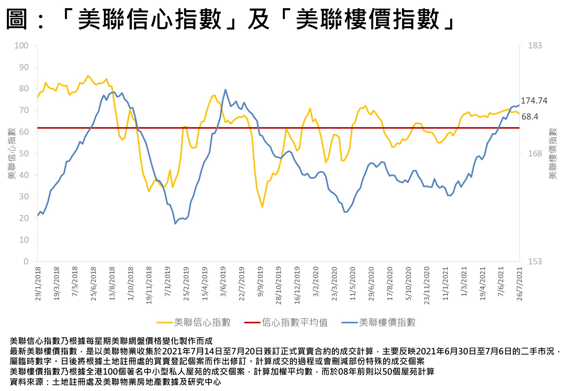 「美聯信心指數」(MCI)最新指數報68.4點,按周跌1.0點,跌幅約1.4%。信心指數回落,顯示新增減價盤數目有所回升。雖然如此,市場氣氛持續向好,交投旺勢持續,信心指數繼續維持於平均值(屬樓價好淡分界綫)之上,已為時24周,為有紀錄以來的第二長的時段,可見樓價有上升動力,將挑戰歷史新高。