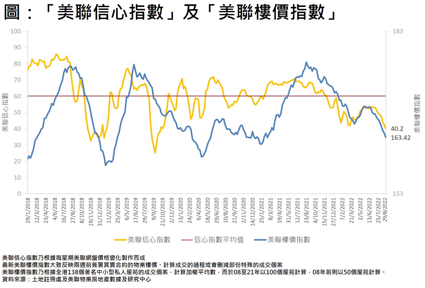 「美聯信心指數」(MCI)是根據美聯物業網上搵樓的網盤價格變化製作而成,於每個星期一公佈,從網盤的價格轉變,反映業主的放盤態度,以作為未來樓價走勢指標。指數上升代表減價盤減少,樓價上升機會增;指數下跌代表減價盤增加,樓價下跌機會大。信心指數走勢是徘徊於0至100之間,100點表示放盤業主全面看好,0點則表示放盤業主全面看淡,「信心指數平均值」則是此指數由2018年初至今的平均值,屬睇好或睇淡後市的分界線。當「美聯信心指數」(MCI)跌穿此指數的平均值時,表示樓價有機會由升轉跌或跌勢加快。當「美聯信心指數」(MCI)升穿此指數的平均值時,表示樓價有機會由跌轉升或升勢加快。指數的升跌幅並非直接反映樓價升跌幅,但從指數走勢可推測4星期或之後樓價向上或向下的趨勢。