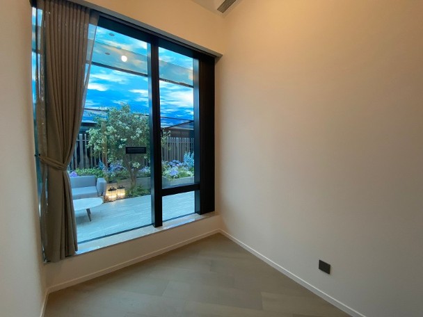 無改動裝修示範單位參照低座住宅大樓EDEN的D座地下B單位搭建,實用面積627方呎,為三房一套連花園的特色戶型,層與層之間高度約3.5米。客飯廳布局呈長方形,近大門位置設有開放式廚房,爐具家電設別齊全。客廳及主人睡房均連接457方呎私人花園,地面以天然石材鋪砌,附戶外傢俱及燒烤爐,適合住戶與親朋戚友把酒言歡和燒烤。主人睡房預設多功能衣帽間,有別傳統衣櫃,內置空氣淨化功能、LED照明、多樣化儲物櫃及化妝品專用保鮮冷藏箱等。其餘兩間睡房亦方正實用,當中有一間更預留位置擺放衣櫃。