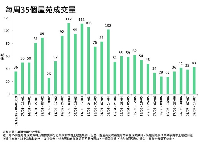 35屋苑交投量低位反覆。綜合美聯分行資料,過去一周(7月8日至7月14日)全港35個大型屋苑錄43宗買賣,較前一周(7月1日至7月7日)39宗按周微增4宗(見圖)。