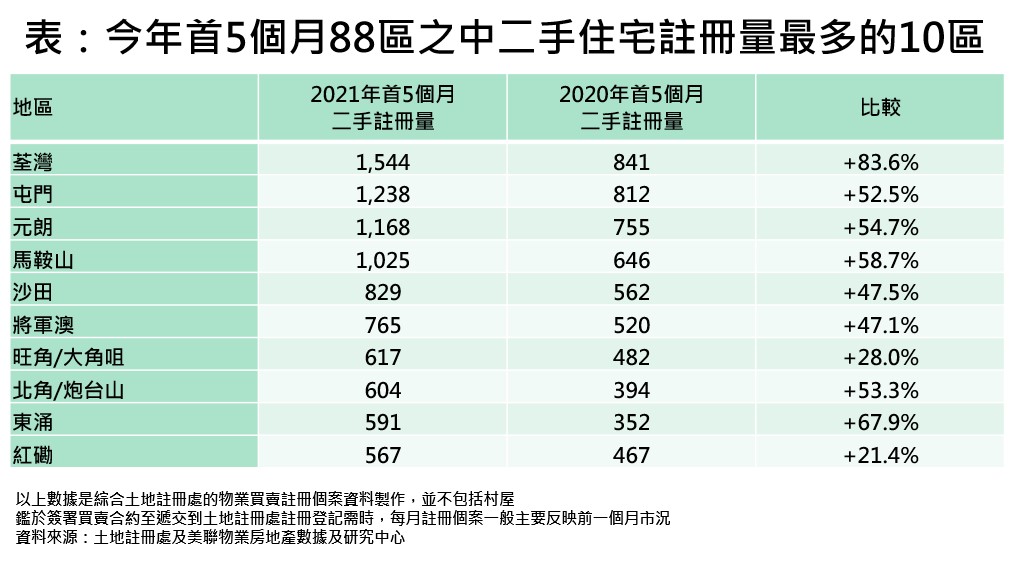 據美聯物業房地產數據及研究中心綜合土地註冊處買賣註冊登記個案並將全港劃分為88區分析,今年首5個月宗數最多的10區中,均較去年同期悉數上升,當中4區二手住宅註冊量更已突破千宗(見表)。