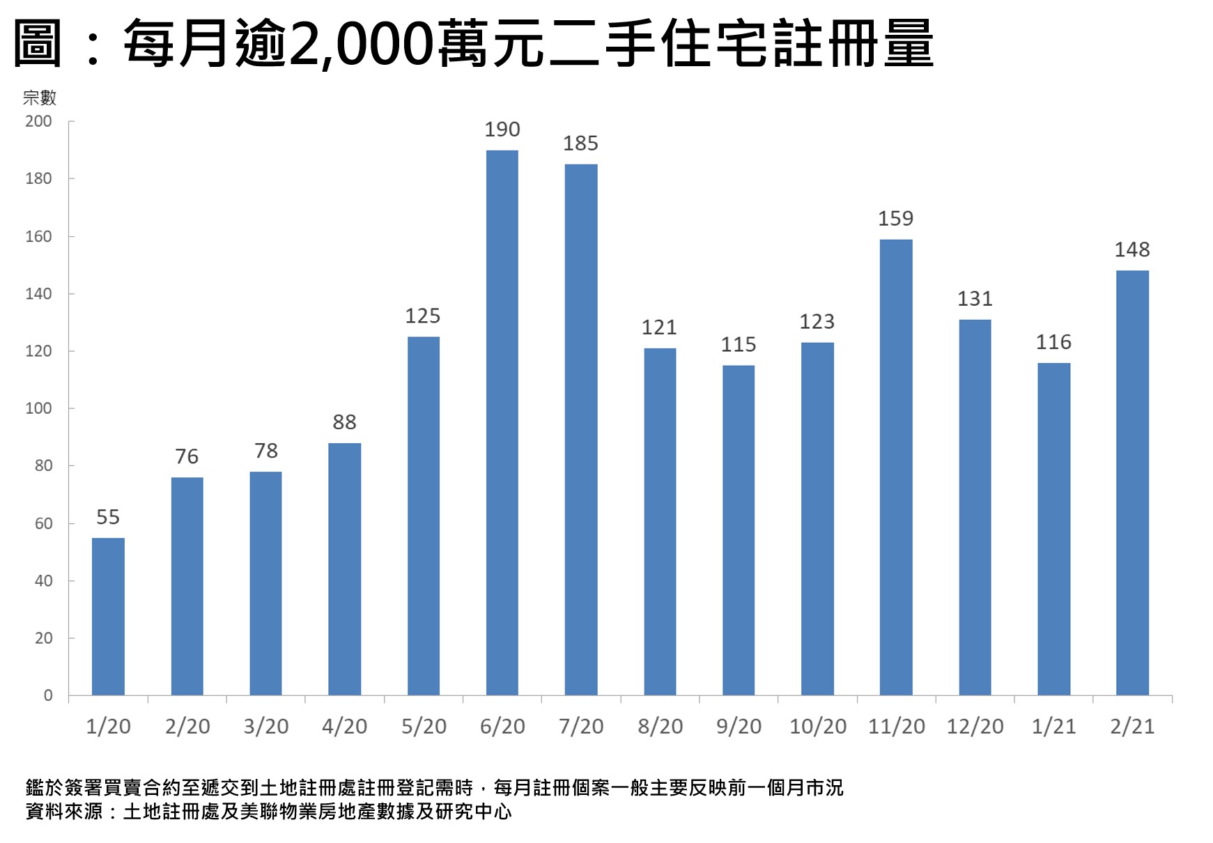 據美聯物業房地產數據及研究中心綜合土地註冊處資料顯示,2月逾2,000萬元二手住宅註冊量錄148宗,比起1月116宗高出約27.6%,連跌2個月後回升,並創3個月新高;若與去年2月76宗相比,今年2月宗數按年更大幅上升約94.7%(見圖)。