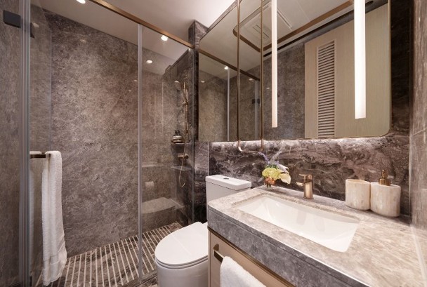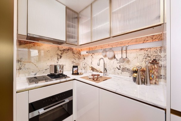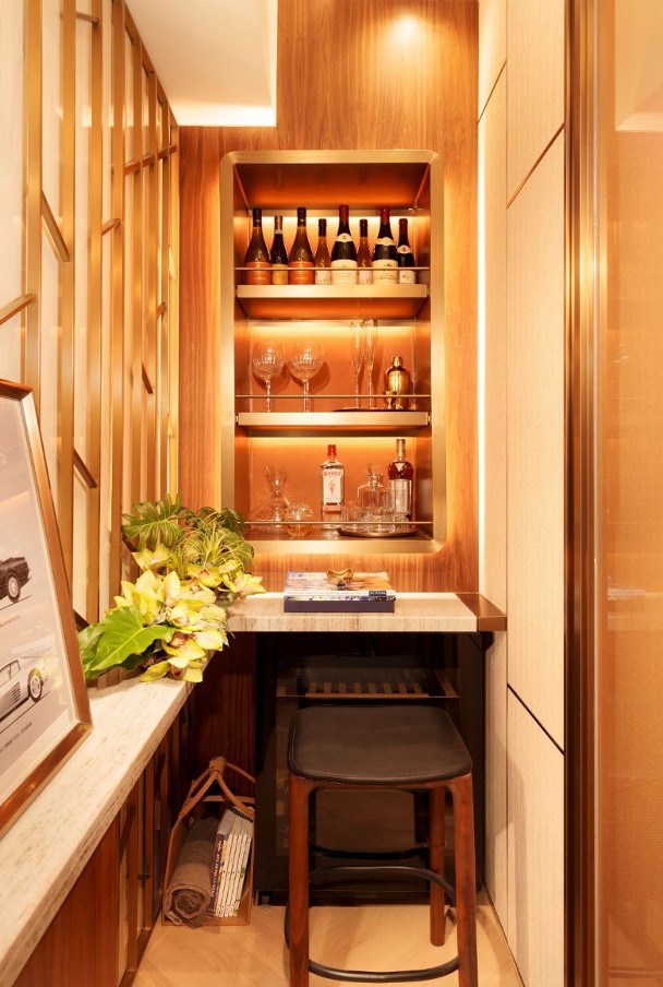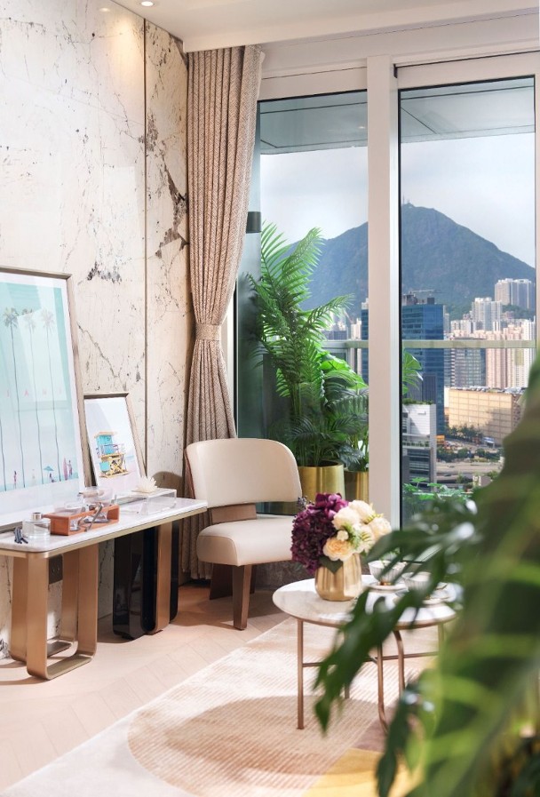 該單位附連裝修及家具,室內設計融合邁阿密海灘活力與優雅格調。以清新白色及香檳金色為主調。客飯廳間隔分明,地板以天然淺木色人字紋鋪砌,牆身用上特色油漆及金色線條鑲邊,電視牆鋪砌特色天然石。兩間睡房與客廳同向,盡享開揚九龍灣景致。主人房放置床後仍可設置衣櫃。設計師將儲物室打造為品酒空間。