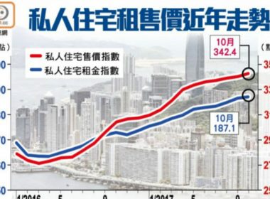 差饷物业估价署公布的最新数据显示,截至今年10月份私人住宅售价指数报342.4点,按月再升约0.53%,再创有纪录新高。按年计,今年10月升约12.5%。上述…