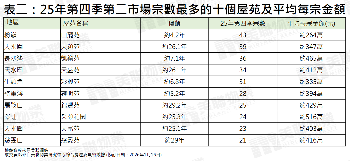 若以去年第四季第二市場成交量最多的屋苑劃分,粉嶺山麗苑以43宗排第一位,天水圍天頌苑以39宗緊隨其後,長沙灣凱樂苑、天水圍天盛苑、牛頭角彩興苑分別以36宗、34宗及31宗躋身5強;季內成交量最多的10個屋苑中,平均每宗金額最低的是宗數最多的山麗苑,平均每宗約264萬元;至於最高的是彩虹采頤花園,平均每宗錄516萬元(見表二)。