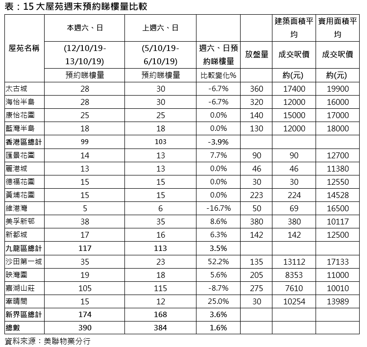 本週末(10月12日至13日) 15個指標二手屋苑預約睇樓量較上週末輕微回升約1.6%。美聯物業住宅部行政總裁布少明表示,社會事件有緩解跡象,交通逐步回復正常,二手睇樓量本可進一步回升,惟新一份《施政報告》將於下週三發表,市場預期特首將在房屋供應上著墨,推出種種措施,以長遠解決困擾已久的住屋問題,不少準買家靜待《施政報告》的相關措施,才決定入市步伐,令市場上觀望氣氛仍然濃厚。另一邊廂,九龍全新盤平霸開盤,極具吸引力,短期勢凍結區內購買力,是為二手睇樓活動未見顯著上升的另一原因,由於10月份仍有多個新盤預接續推出,料一手主導市場情況持續。
