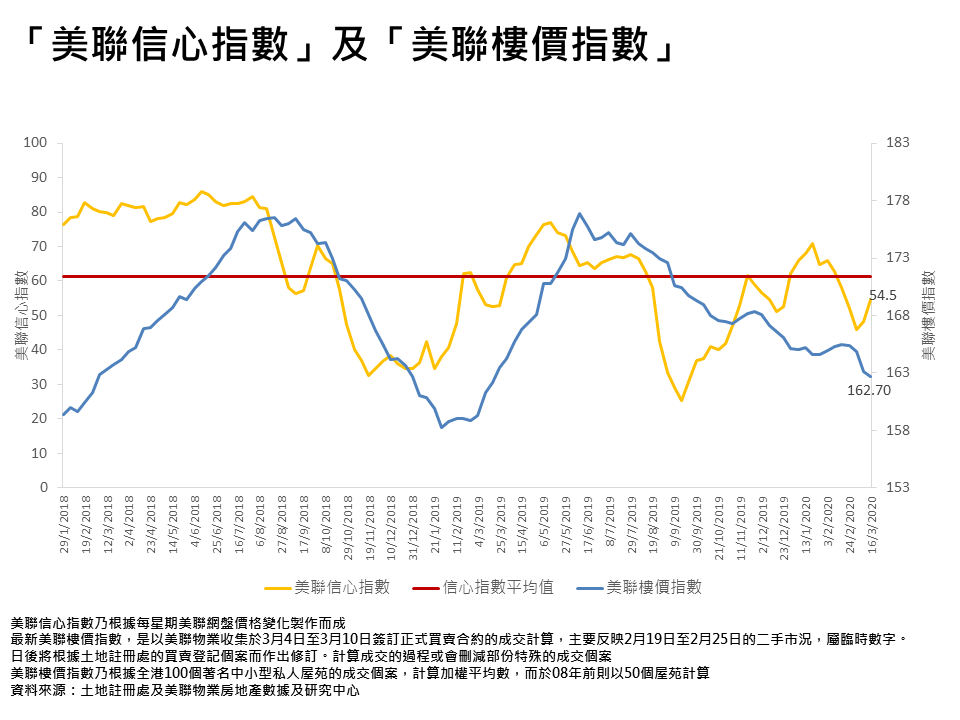自美國聯儲局於3月初突然減息半厘後,15日又再突然減息1厘,同時又推出7,000億美元量化寬鬆(QE)計畫。此舉雖然有利樓市,但全球肺炎疫情擴散及環球股市下挫,或令業主對前景抱觀望態度,甚或寧可暫時封盤,估計樓市將呈好淡爭持局面,短期樓價將持續受壓。事實上,即使「美聯信心指數」(MCI)有所回升,但仍未升穿「信心指數平均值」,反映業主普遍信心仍然未回復。
