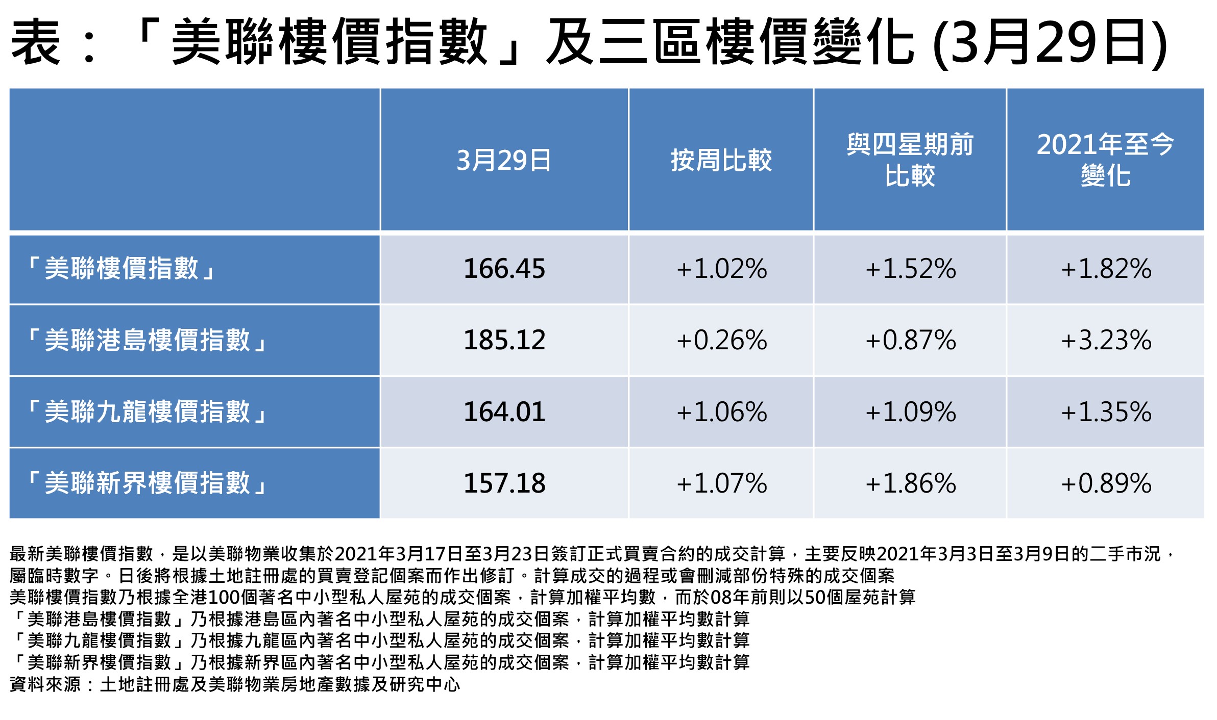美聯樓價指數乃根據全港100個著名中小型私人屋苑的成交個案,計算加權平均數,而於08年前則以50個屋苑計算。最新美聯樓價指數,是以美聯物業收集於2021年3月17日至3月23日簽訂正式買賣合約的成交計算,主要反映2021年3月3日至3月9日的二手市況,屬臨時數字。日後將根據土地註冊處的買賣登記個案而作出修訂。計算成交的過程或會刪減部份特殊的成交個案。