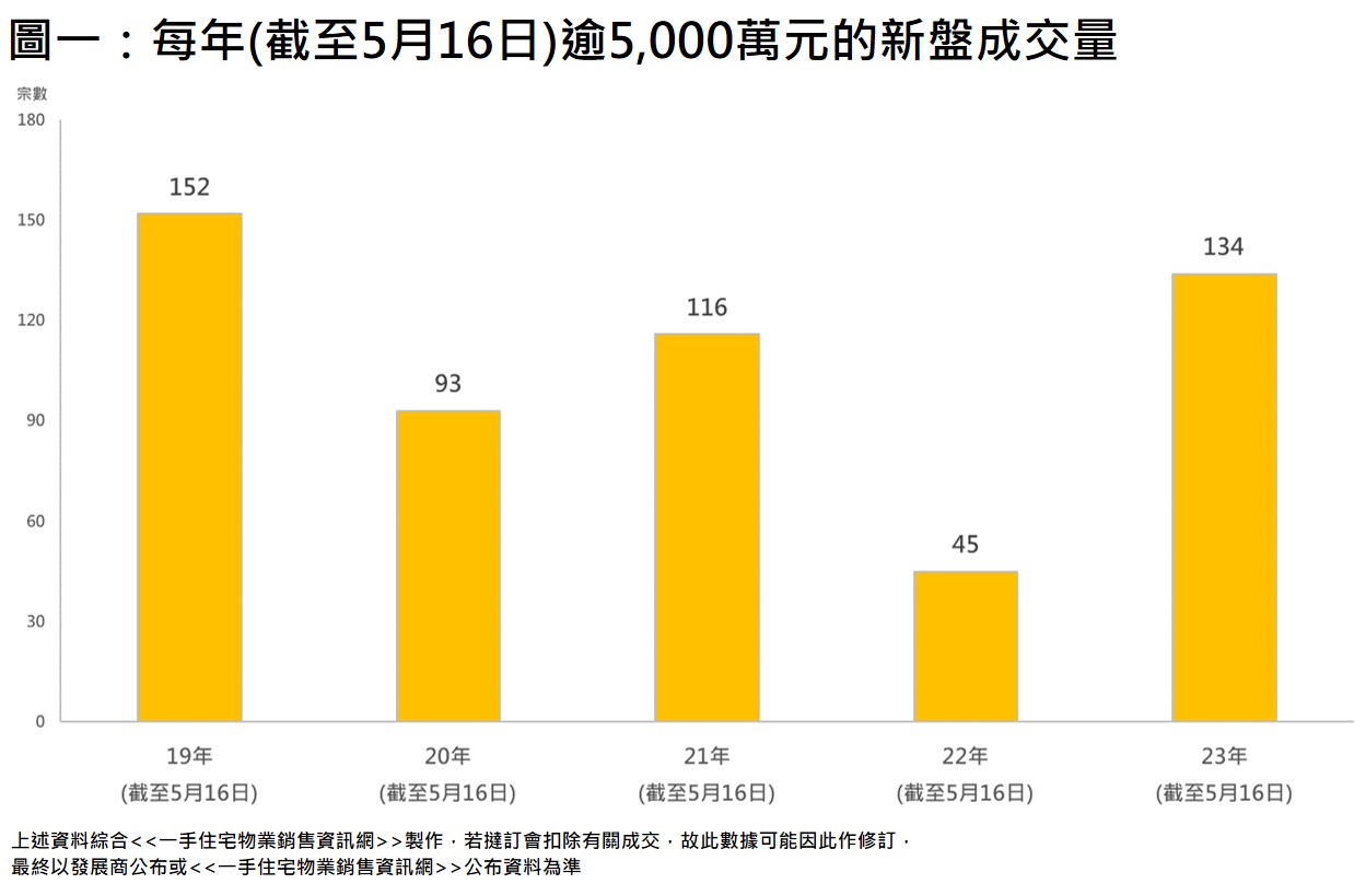 當中豪宅新盤表現尤其理想,本年(截至5月16日)逾5,000萬元新盤成交量錄134宗,較去年同期45宗大幅急升約197.8%,甚至已超越去年全年115宗,高出約16.5%。若以每年同期計算,本年已創4年同期新高(見圖一)。