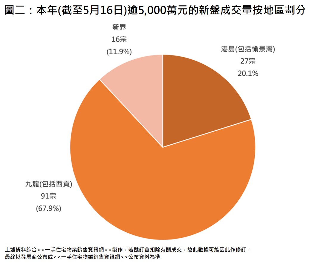 若以本年(截至5月16日)逾5,000萬元個案按3區劃分,九龍區(包括西貢)錄91宗,佔約67.9%,為3區最多;當中啟德佔43宗,澐璟以24宗逾5,000萬元個案最多,天瀧與尚.珒溋各錄6宗,嘉峯匯則有4宗;何文田ST. GEORGE’S MANSIONS錄19宗,西南九龍維港滙II則有11宗逾5,000萬元個案(見圖二)。