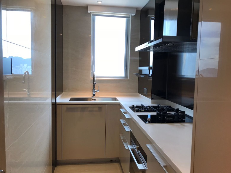 單位間隔四房雙連套連書房設計,大廳連接的露台面積52方呎,大廳及主人套房均享開揚維港海景。廚房部分以開放式設計。
