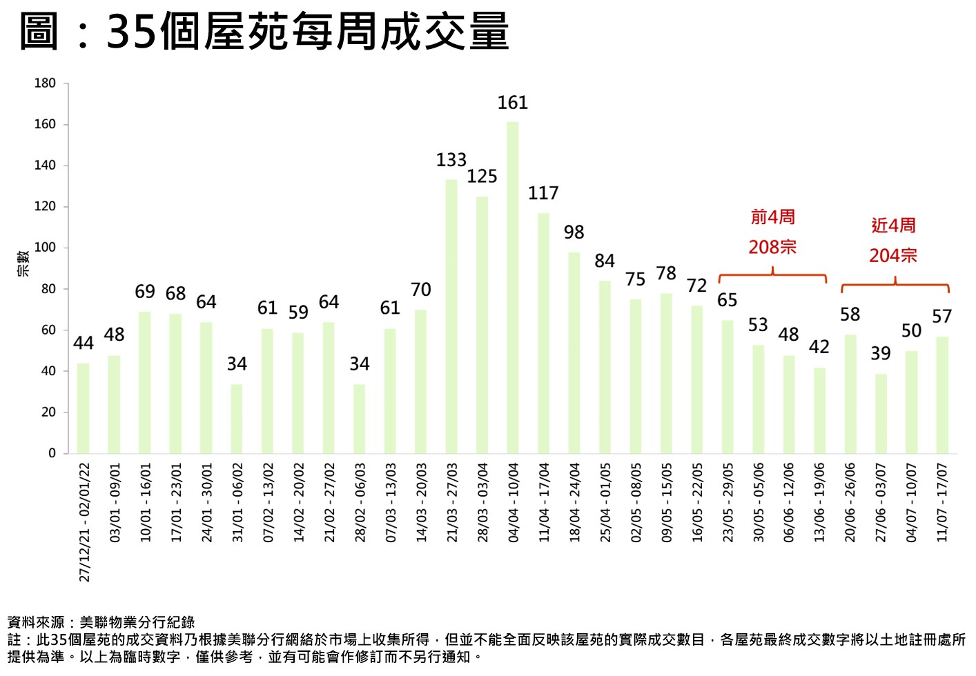 隨著二手交投有喘穩跡象,近4周35屋苑成交量較前4周相若。若以過去4周合計,6月20日至7月17日合共錄204宗,與前4周(5月23日至6月19日)208宗相若,僅回落約1.9%(見圖)。