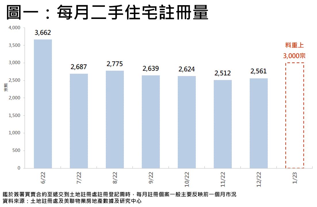 據美聯物業房地產數據及研究中心綜合土地註冊處資料顯示,2022年12月全港二手住宅註冊量共錄2,561宗,按月輕微回升約2%,宗數連跌3個月後喘穩(見圖一)。由於簽署買賣合約至遞交到土地註冊處註冊登記需時,12月註冊個案主要反映11月市況。踏入12月,市場憧憬中港兩地全面通關,樓市氣氛回暖,料今年1月註冊量將反映出來,二手住宅註冊量有望重上3,000宗水平,創7個月新高(見圖一)。