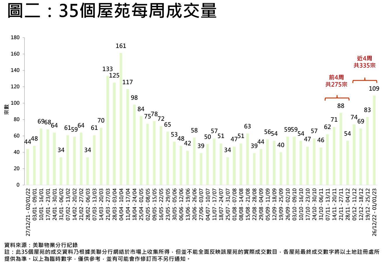 至於最新二手市況,可從35屋苑近期交投表現略知一二。隨著中港全面通關在即,近期35屋苑二手交投顯著回升。綜合美聯分行資料,全港35個大型屋苑過去一周(22年12月26日至23年1月1日)合共錄109宗成交,比起前一周(12月19日至12月25日)的83宗按周上升約31.3%,連升2星期,並創逾8個月(37周)新高;若以過去4周(22年 12月5日至23年1月1日)合計,共錄335宗成交,比起前4周(11月7日至12月4日)的275宗亦上升約21.8%(見圖二)。