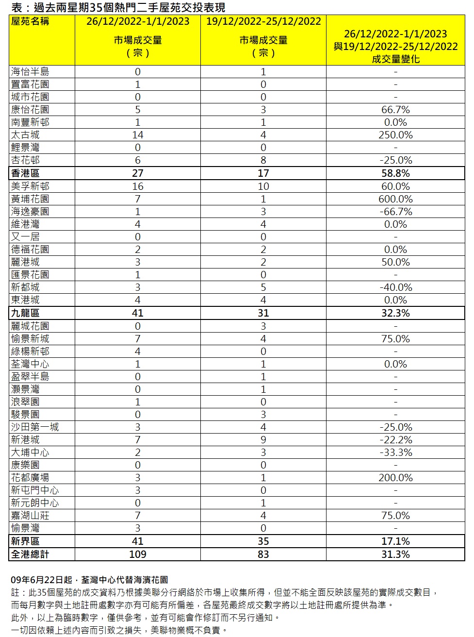 若將35屋苑按3區劃分,3區交投悉數按周上升。港島區8屋苑錄27宗,按周大升約58.8%,當中太古城上周錄14宗,按周大增10宗,表現突出;九龍區10屋苑上周錄41宗,按周升約32.3%,美孚新邨上周錄16宗,按周增6宗;黃埔花園亦同樣按周多6宗;新界區方面,區內17屋苑上周錄41宗,按周亦升約17.1%,當中綠楊新邨增加4宗,愉景新城、新屯門中心、嘉湖山莊及愉景灣各多3宗(見表)。