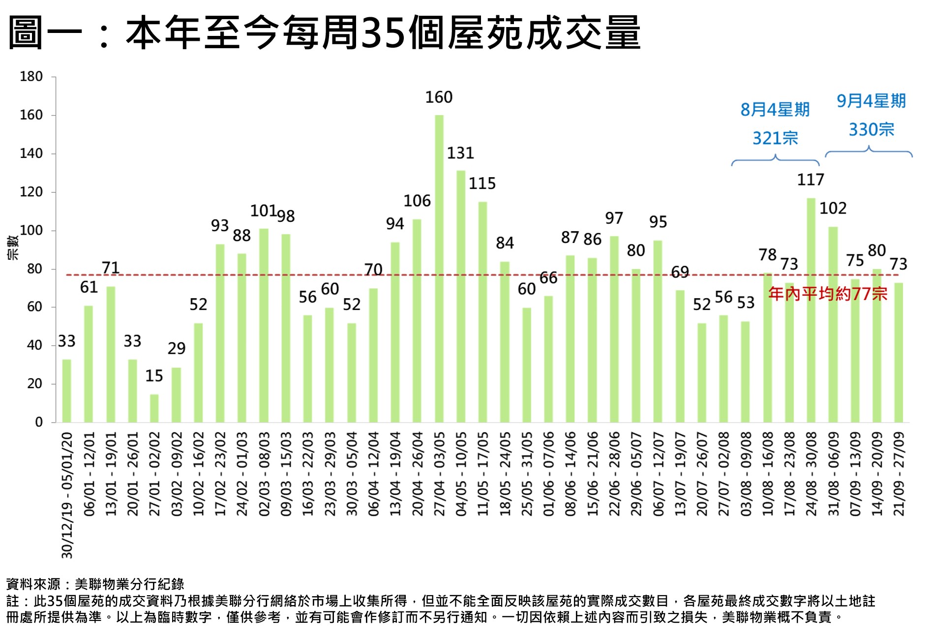 若以近4星期(8月31日至9月27日)計,35屋苑共錄330宗成交,較8月4星期(8月3日至8月30日)321宗升約2.8%(見圖一)。