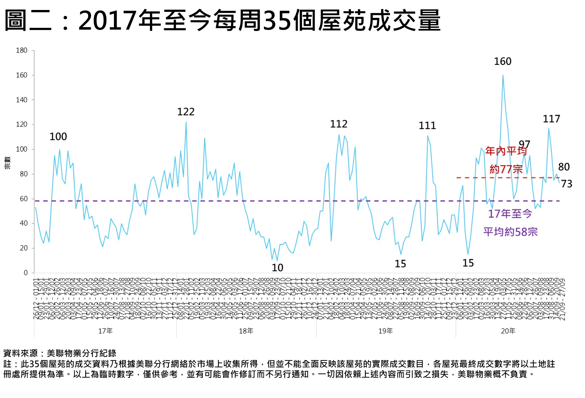 上周35屋苑交投錄73宗,雖然未及本年迄今平均每周約77宗水平,但若與2017年至今平均每周約58宗相比,仍高出約25.9%(見圖二)。