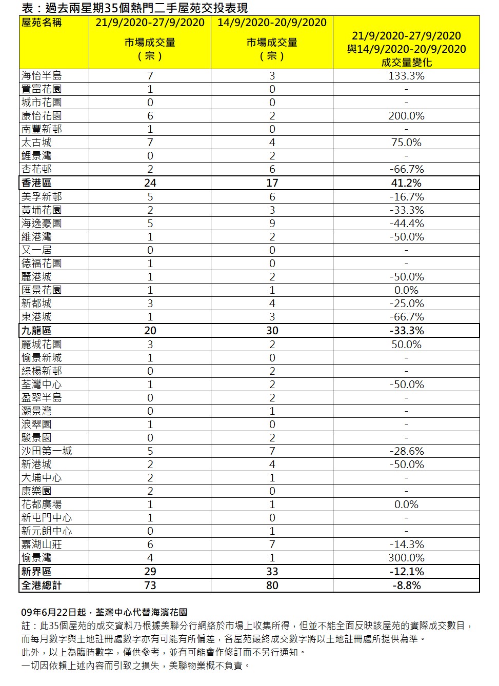 樓市氣氛佳,剛過去周末新盤熱賣之際,35屋苑二手交投仍穩企逾70宗水平。綜合美聯分行資料,過去一周(9月21日至9月27日)全港35個大型屋苑合共錄73宗成交,雖然較前一周(9月14日至9月20日)80宗按周回落約8.8%,但仍穩企逾70宗水平(見圖一)。