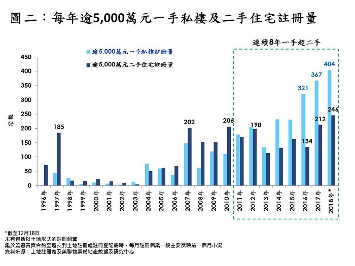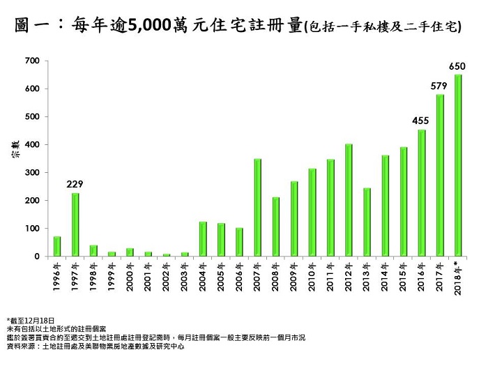 據美聯物業房地產數據及研究中心綜合土地註冊處資料顯示,在不包括以土地形式的註冊個案下,本年迄今(截至12月18日)逾5,000萬元一手私樓及二手住宅註冊量合共錄650宗,打破去年579宗的紀錄高位,高出約12.3%,創紀錄新高(見圖一)。