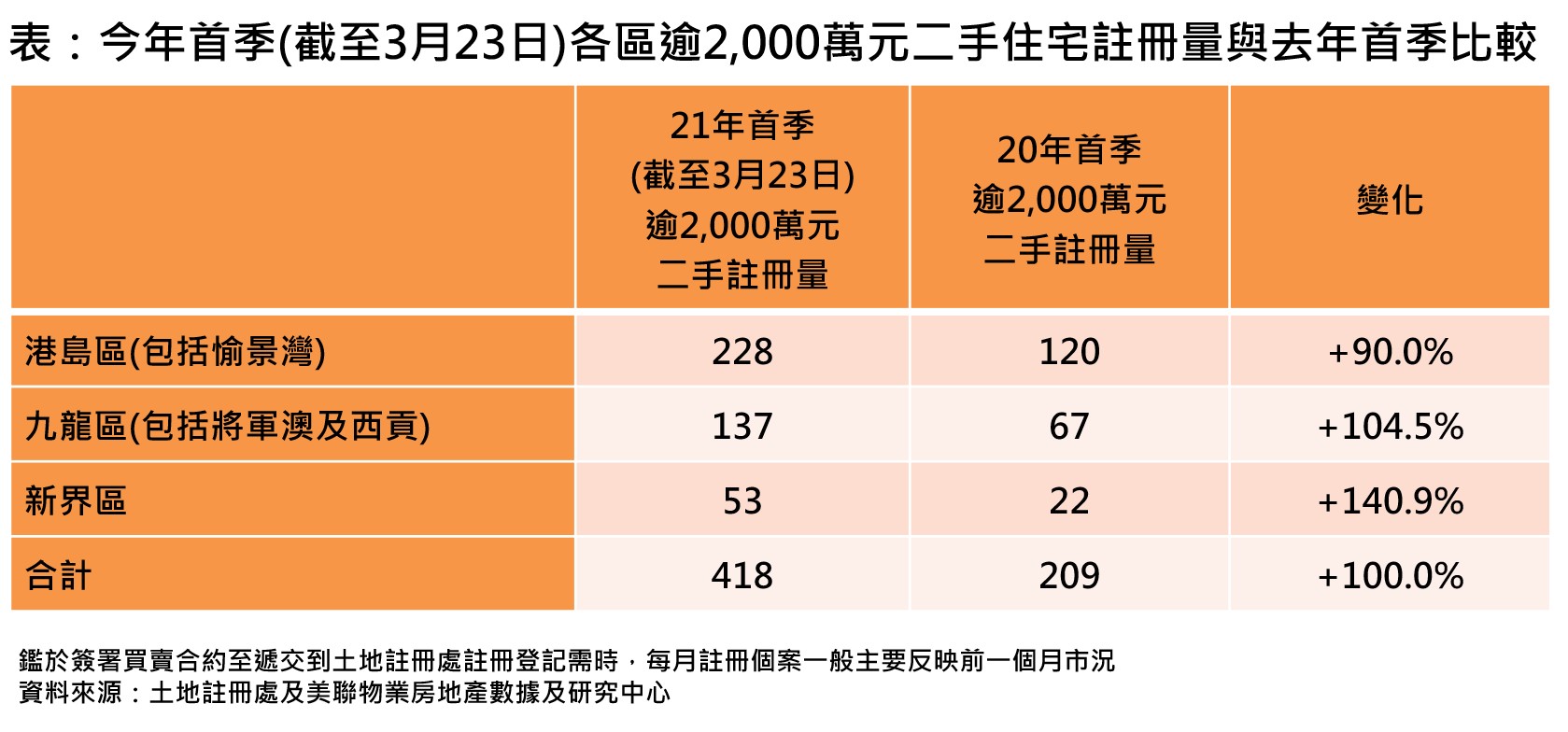 若將本季迄今(截至3月23日)按3區劃分,宗數悉數超越去年首季,當中新界區增幅最顯著,去年首季逾2,000萬元註冊量僅22宗,本季迄今已達53宗,升約1.4倍;九龍區(包括將軍澳及西貢)方面,本季逾2,000萬元註冊量暫錄137宗,按年升幅亦高達104.5%;至於相關銀碼宗數最多的港島區(包括愉景灣),暫以228宗居首,比起去年首季則高出約9成(見表)。