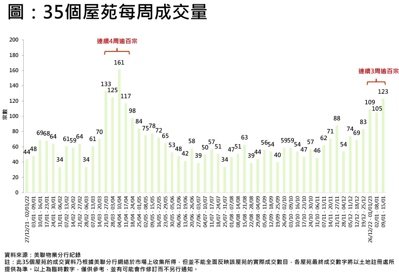 中港首階段恢復通關,進一步利好樓市氣氛,刺激二手交投持續回暖。綜合美聯分行資料,全港35個大型屋苑過去一周(1月9日至1月15日)合共錄123宗成交,較前一周(1月2日至1月8日)的105宗上升約17.1%,創自去年4月上旬後的約9個月(40星期)新高(見圖)。