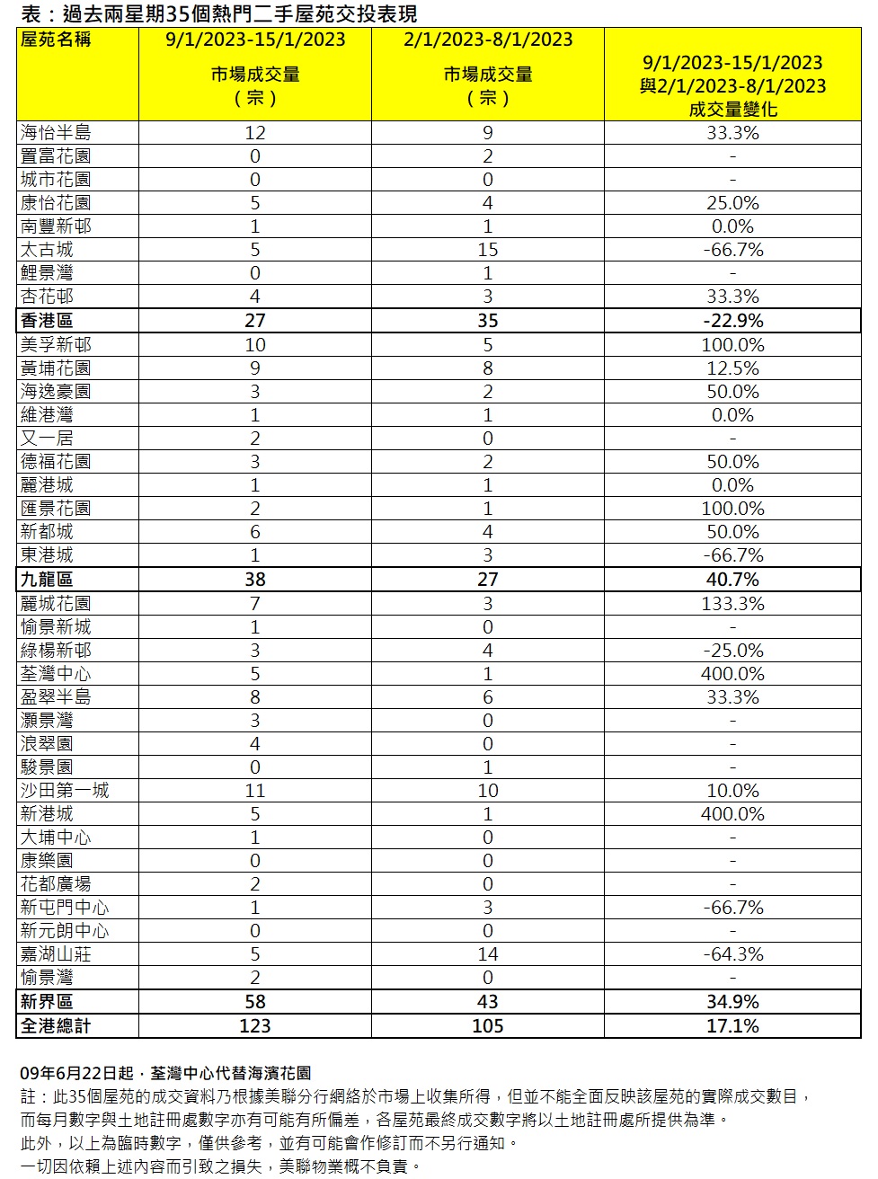 若將35屋苑按三區劃分,九龍區表現出色。區內10屋苑錄38宗,按周大增約40.7%。當中美孚新邨增加5宗,又一居及新都城齊增2宗,黃埔花園、海逸豪園、德福花園及匯景花園各增1宗;區內只得東港城減少2宗之下,九龍區上周宗數顯著增加(見表)。