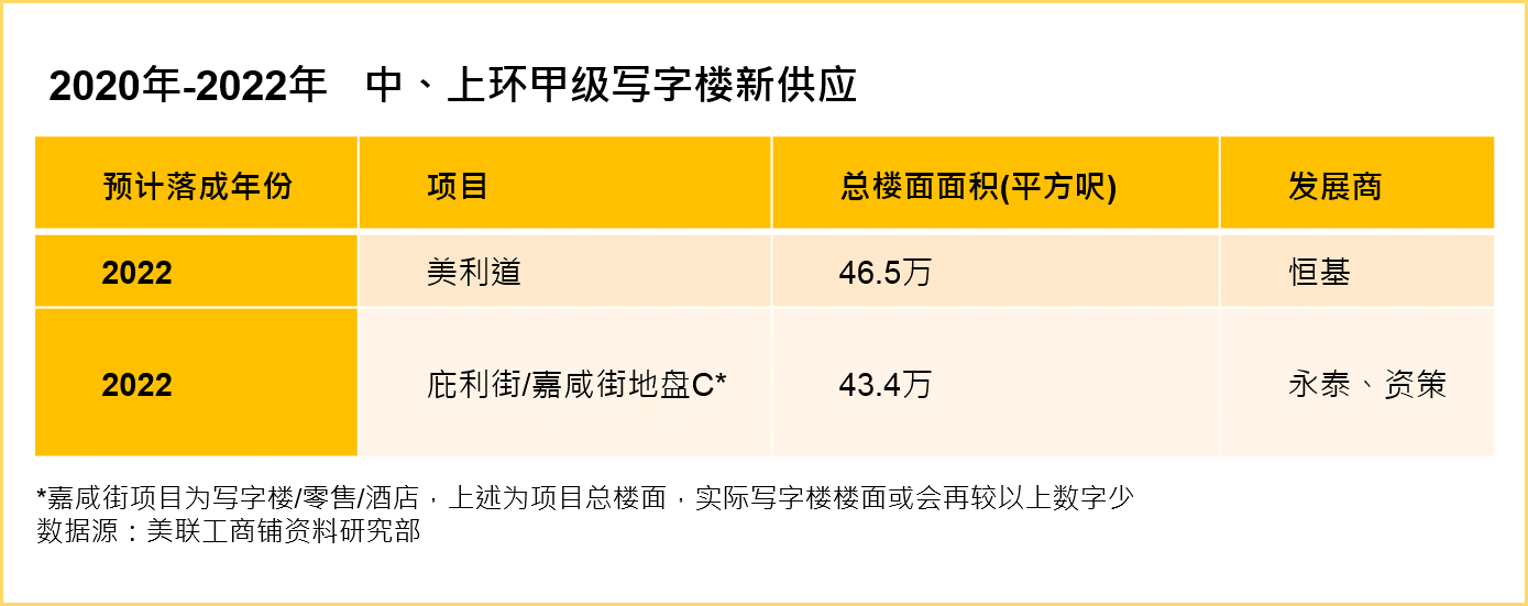 另一方面,中上環甲級寫字樓長期缺乏新供應。據美聯工商鋪資料研究部資料顯示,預計2020至2022年全港共有總樓面面積約852萬平方呎的甲級寫字樓新供應,而中、上環占整體不足1成(見下圖)。很多租戶好不容易躋身進駐A級商廈,甚少會再搬出。
