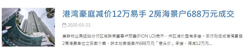 位於西九龍的臨海大型屋苑港灣豪庭,除間隔實用及位置吸引外,動靜兼備的全天候會所設施,同樣是該盤的賣點。過去一周,美聯物業奧運站分行表示,該樓盤有減價承接。成交單位為港灣豪庭6座高層D室,實用面積344方呎,屬2房間隔,景觀開揚,望海景,由於佈局合理,加上房價符合買家預算,吸引本地家庭承接。據瞭解,該單位的放盤叫價為700萬元,因應市況調減12萬,成交價688萬元,減幅約1.7%。資料顯示,原業主于2012年2月斥資366萬元購得,該次轉手帳面大幅獲利322萬元,升值約88%。