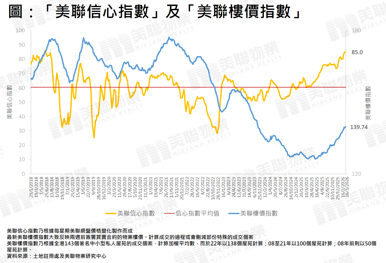 「美聯信心指數」(MCI)是根據美聯物業網上搵樓的網盤價格變化製作而成,於每個星期一公佈,從網盤的價格轉變,反映業主的放盤態度,以作為未來樓價走勢指標。指數上升代表減價盤減少,樓價上升機會增;指數下跌代表減價盤增加,樓價下跌機會大。信心指數走勢是徘徊於0至100之間,100點表示放盤業主全面看好,0點則表示放盤業主全面看淡,「信心指數平均值」則是此指數由2018年初至今的平均值,屬睇好或睇淡後市的分界線。當「美聯信心指數」(MCI)跌穿此指數的平均值時,表示樓價有機會由升轉跌或跌勢加快。當「美聯信心指數」(MCI)升穿此指數的平均值時,表示樓價有機會由跌轉升或升勢加快。指數的升跌幅並非直接反映樓價升跌幅,但從指數走勢可推測4星期或之後樓價向上或向下的趨勢。