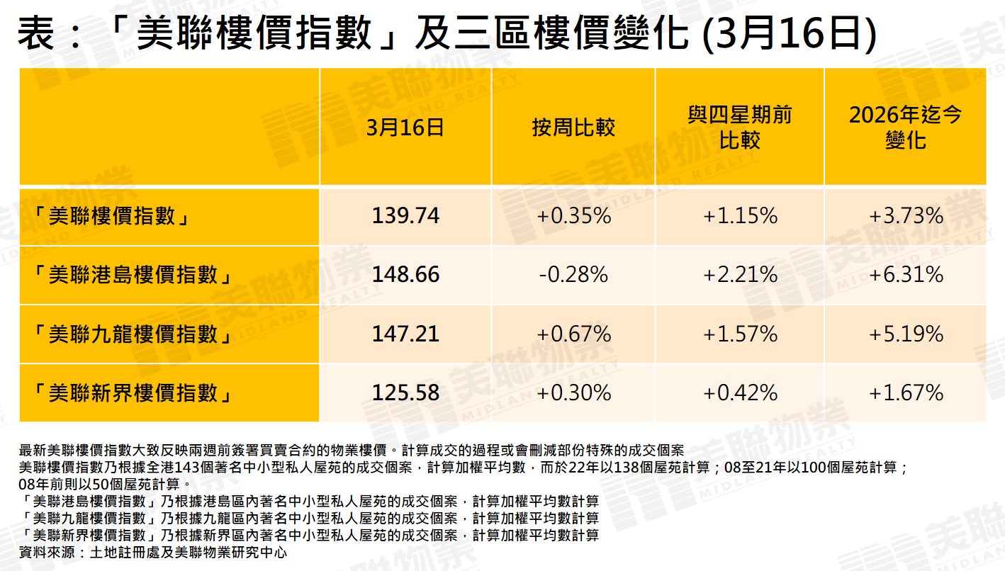 樓價回落一周後再度上升,「美聯樓價指數」最新報139.74點,按周升0.35%,比起四星期前上升1.15%,本年迄今樓價升3.73%,較去年低位累升10.66%,並創自2023年12月初後的逾2年新高(見圖)。