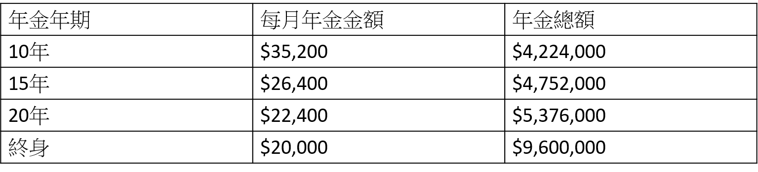 如果提取年金年期較短,每月可提取的年金金額為$35,200,如果選擇終身提取,每月可提取的年金金額為$20,000。如果希望直至百年歸老均擁有穩定收入,可考慮終身提取$4,027,680。