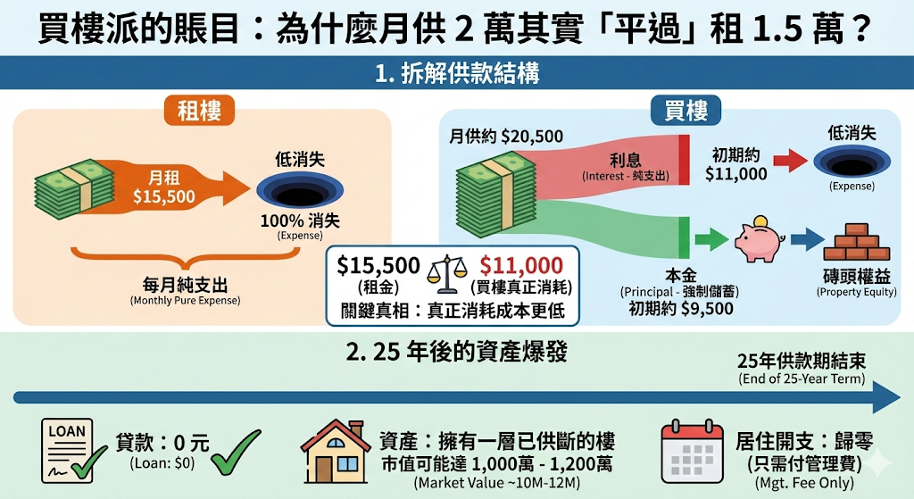 - 買樓: 每月真正的「支出」只是給銀行的利息 $11,000。剩下的 $9,500 其實是幫你償還貸款,等於將現金轉化為磚頭權益。