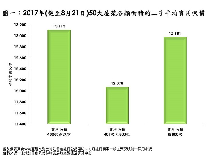 單位愈細呎價愈貴,據美聯物業房地產數據及研究中心綜合土地註冊處資料顯示,選取50大屋苑計算,年內迄今實用面積400呎或以下平均呎價錄13,113元,較同期逾800呎大單位12,981元高出約1%,比起401呎至800呎的中小型單位12,078元更貴約8.6%(見圖一)。
