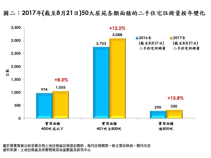 據資料顯示,本年迄今(截至8月21日) 50大屋苑二手住宅註冊量中,實用面積400呎或以下的細單位表現最失色,與去年同期(同樣截至8月21日)按年僅增約8.3%;反之,401呎至800呎則升約12.2%,而超過800呎的單位宗數按年更錄約13.8%升幅(見圖二)。